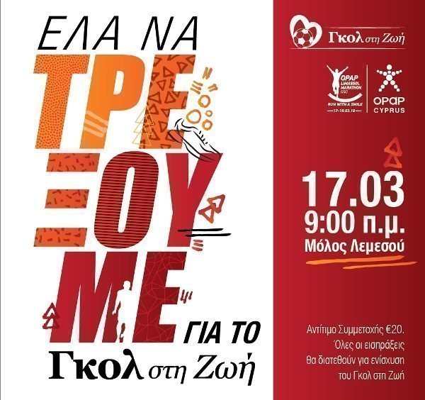 Το Γκολ στη Ζωή τρέχει στον ΟΠΑΠ Μαραθώνιο Λεμεσού ΓΣΟ. Έλα να τρέξουμε ή να περπατήσουμε μαζί 5χλμ, το Σάββατο, 17 Μαρτίου στις 9.00πμ στο Μόλο της Λεμεσού και να στηρίξουμε την προσπάθεια του Εθελοντικού – Φιλανθρωπικού Οργανισμού των ποδοσφαιριστών.