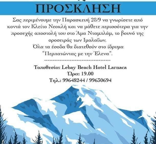 Το «Γκολ στη Ζωή» στηρίζει την αποστολή του Κλείτου Νεοκλή να αναρριχηθεί στην κορυφή Άμα Νταμπλάμ, της οροσειράς Ιμαλαΐων, από την οποία όλα τα έσοδα θα δοθούν στο ίδρυμα «Περπατώντας με την Έλενα», στην μνήμη της Έλενας Μυτίδη, αδελφής του ποδοσφαιριστή Νέστωρα Μυτίδη. Την Παρασκευή, 28 Σεπτεμβρίου και ώρα 19:00, στο ξενοδοχείο «Le Bay» στη Λάρνακα, θα γίνει η παρουσίαση της προσπάθειας του Κλείτου. Είναι ένα πρωτόγνωρο και δύσκολο εγχείρημα, καθώς μόνο μία φορά στο παρελθόν επιχειρήθηκε κάτι τέτοιο από Κύπριο. Είναι...